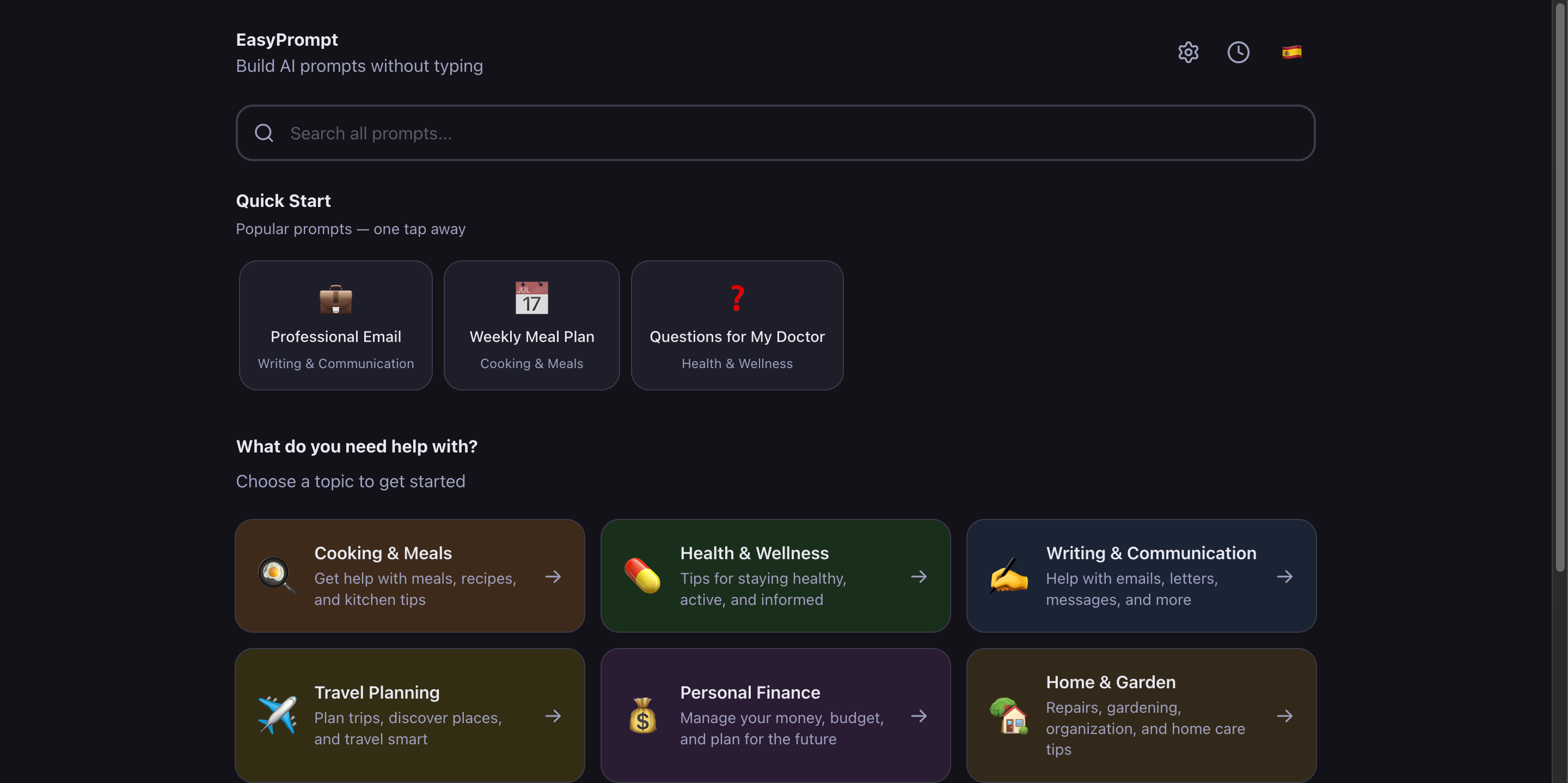A PWA that lets you build AI prompts without typing a single word. Designed for non-technical users and older adults: pick a category, a task and modifiers, and the app generates a ready-to-use prompt you can copy or open directly in ChatGPT, Claude or Gemini. Built with TanStack Start, Drizzle, PostgreSQL and Zustand.